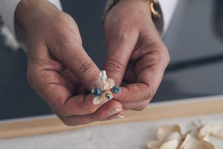 Flores preservadas de nuestra huerta —rosas eternas o hortensias secas— preservan aroma y color indefinido, combinadas con pedrería en burdeos, plata y cristal checo para destellos sutiles. Perlas de río irregulares o piezas exclusivas como broches vintage cierran el relato, honrando la artesanía que resiste modas.