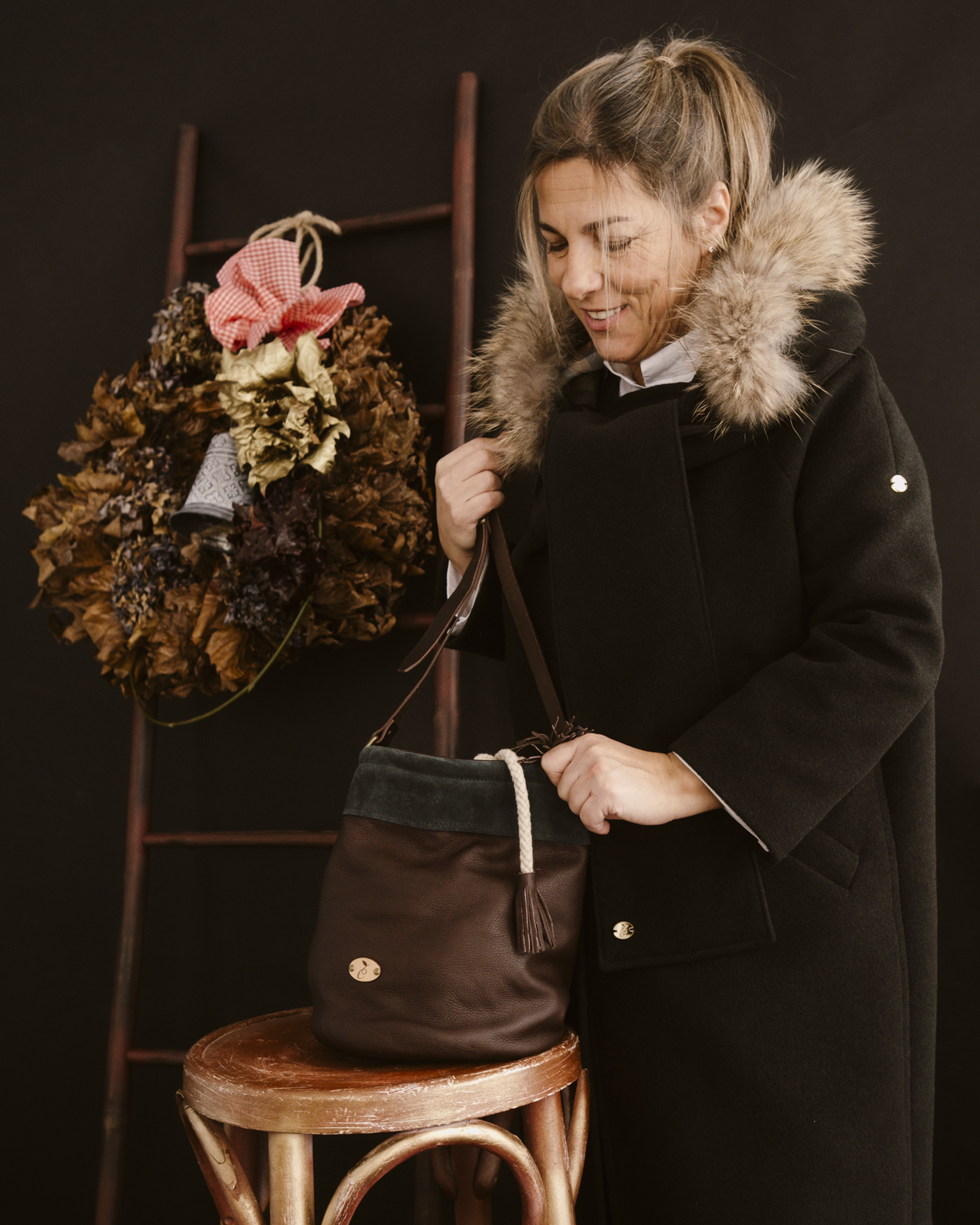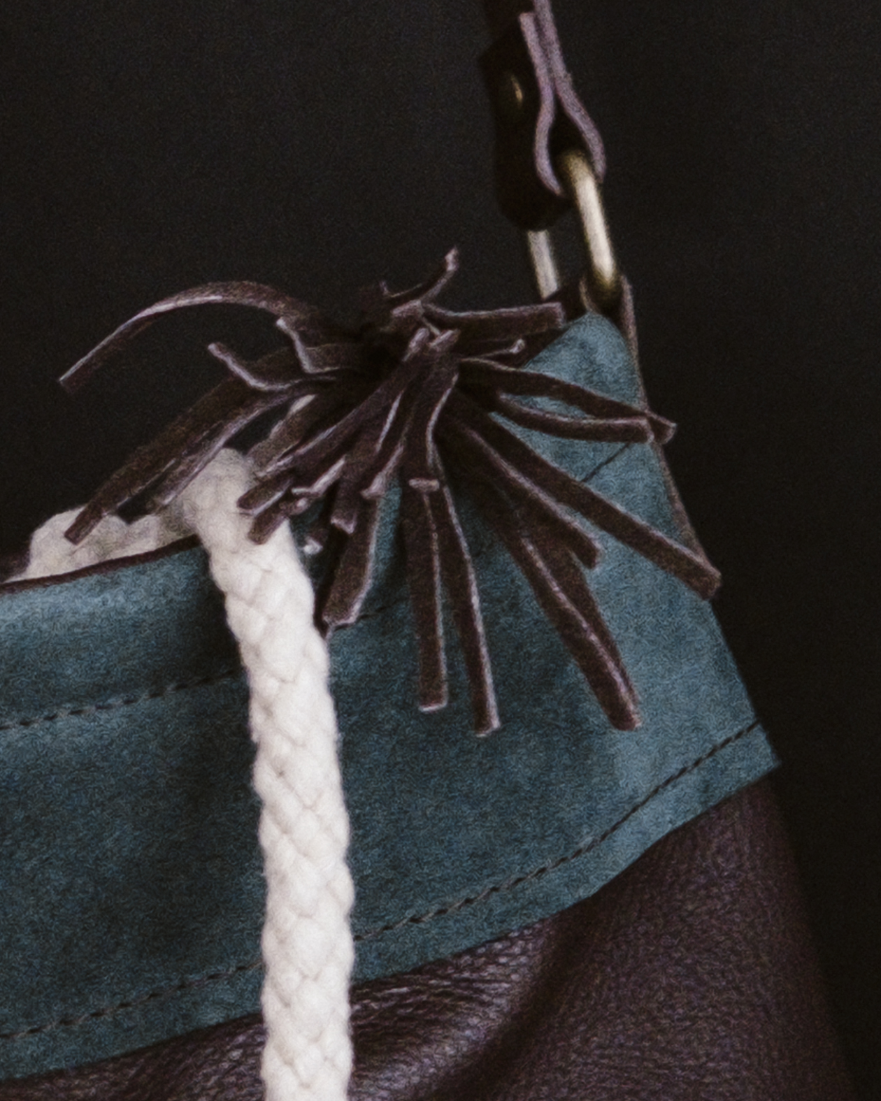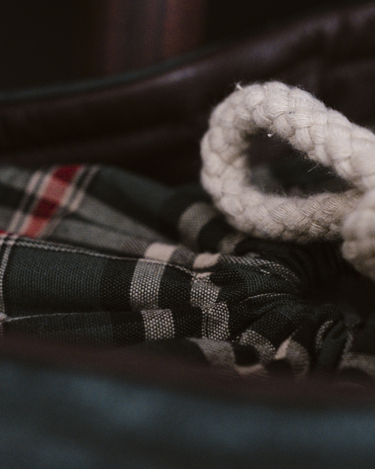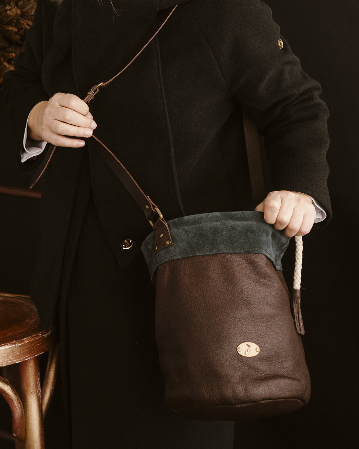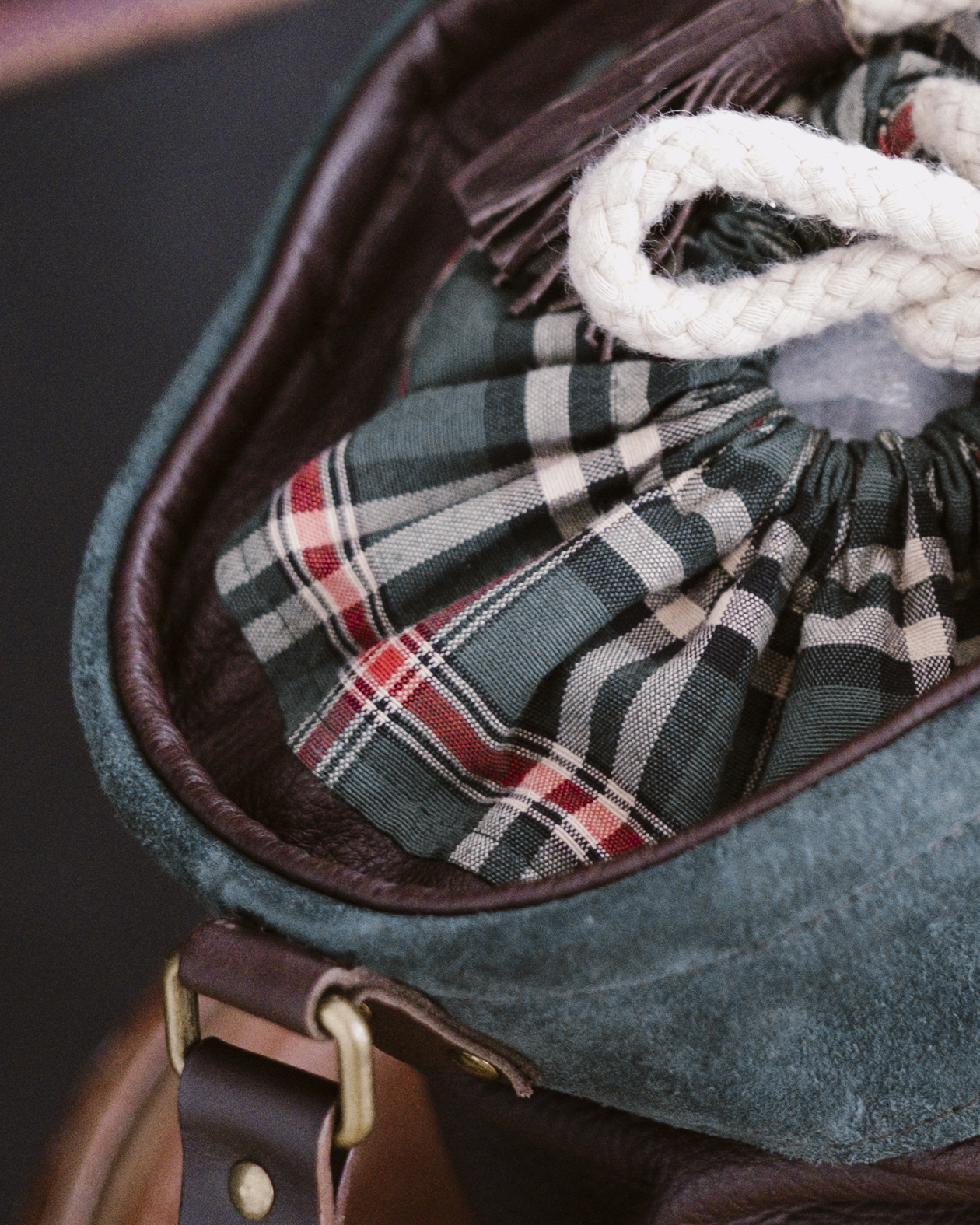 El cierre se realiza mediante una cordura gruesa de algodón que se ajusta con facilidad y termina en borlas de piel, un gesto decorativo que subraya el carácter artesanal de la pieza. El interior está totalmente forrado en tela de cuadros escoceses e incorpora un bolsillo interior, pensado para mantener a salvo las pequeñas cosas importantes.