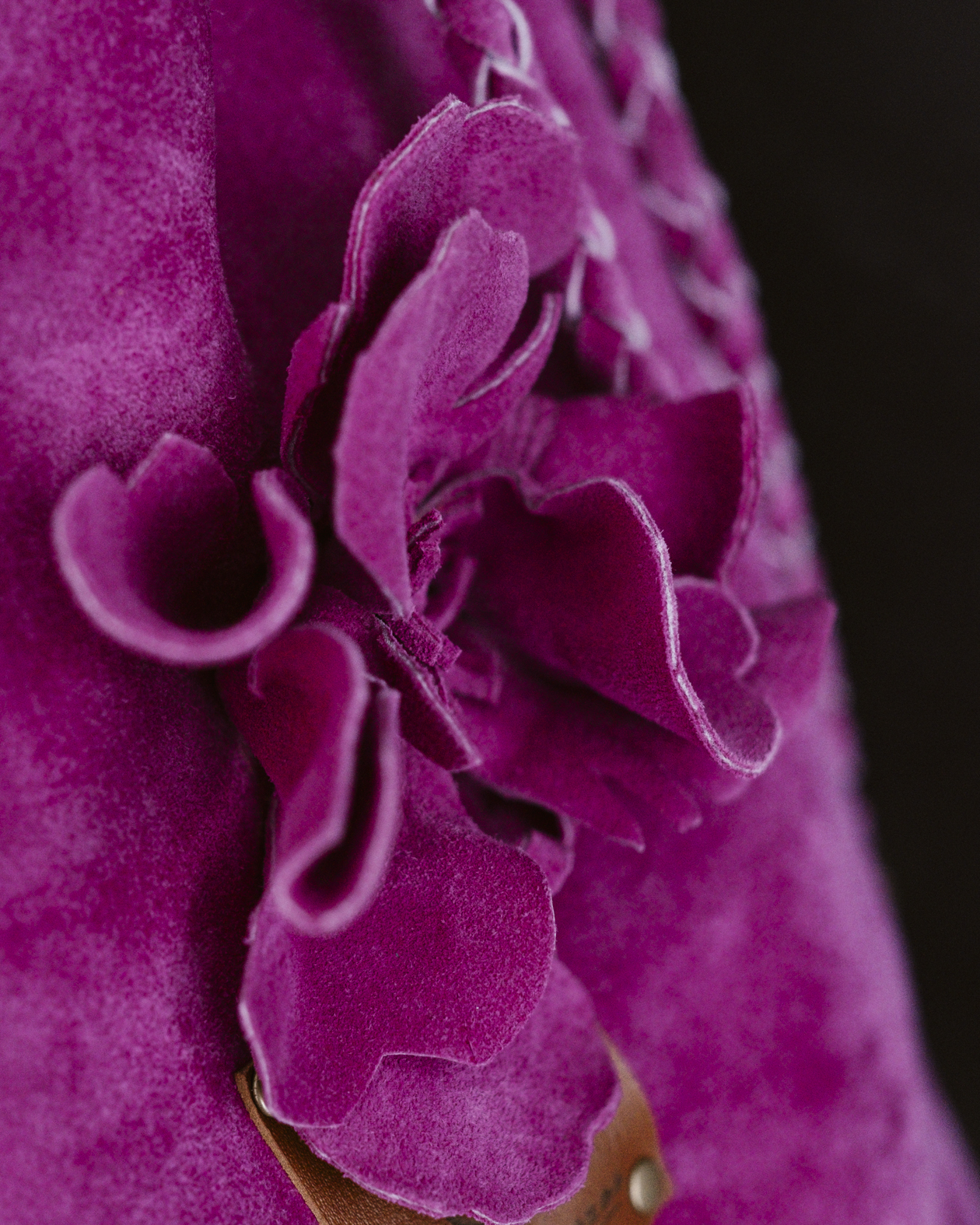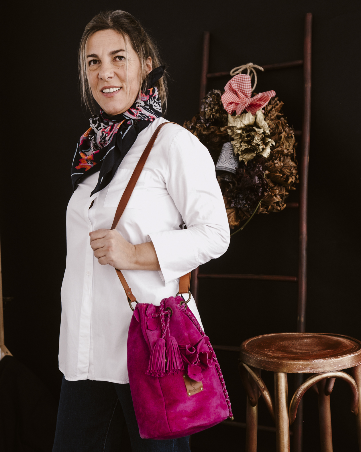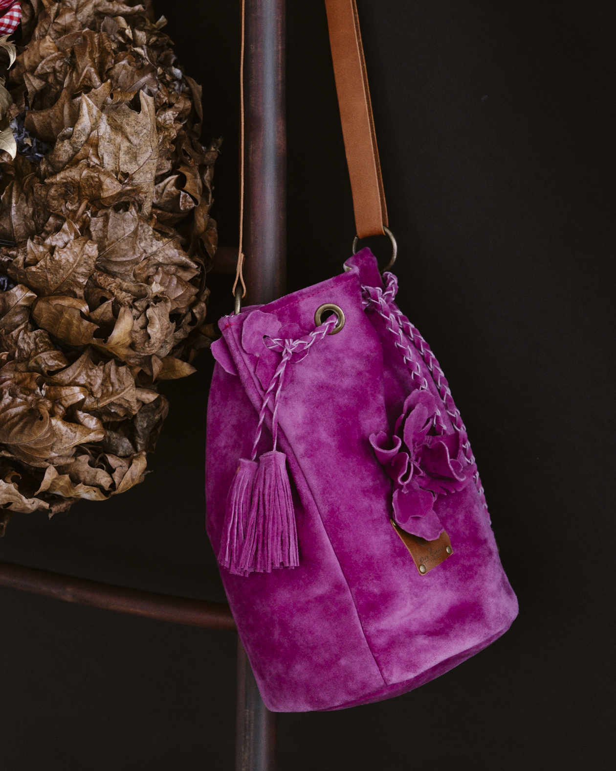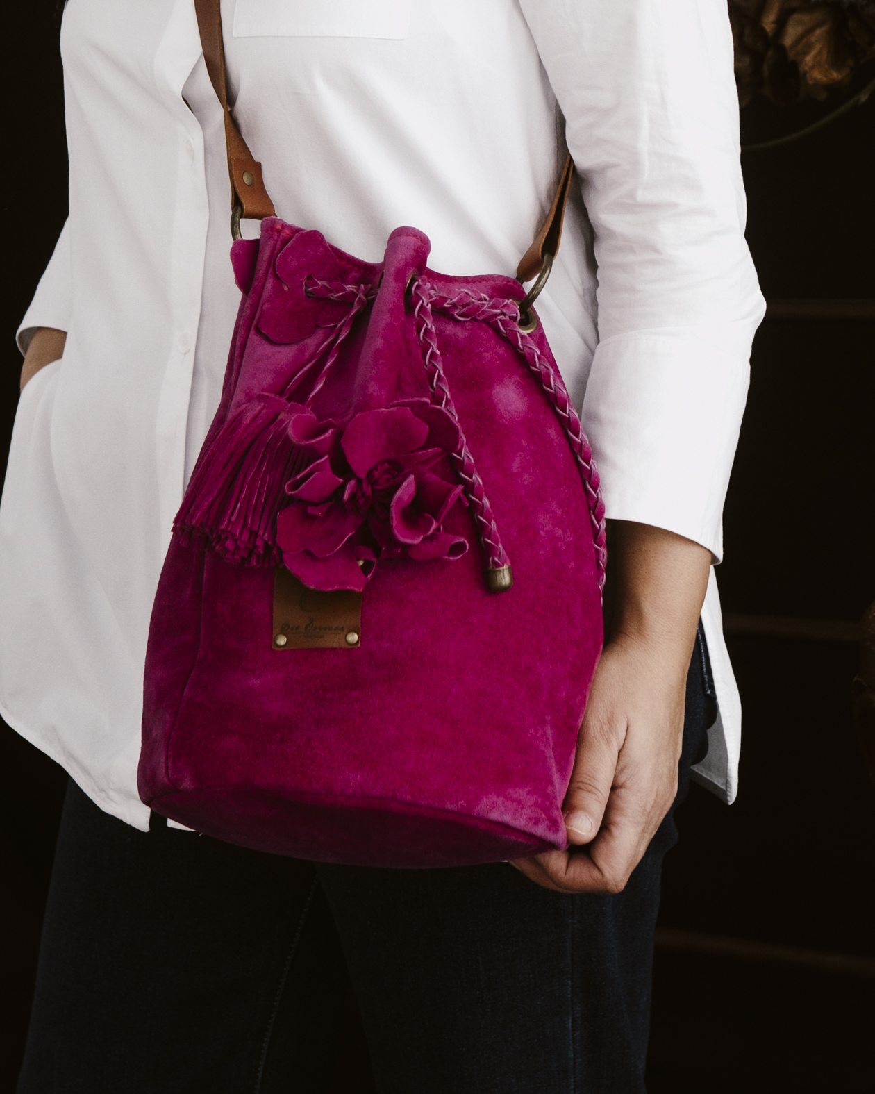Confeccionado en piel 100% serraje en un intenso tono rosa fucsia, Christine mantiene una estructura flexible y agradable al tacto, realzada por el cierre de cordón elaborado en la misma piel, con tiras trenzadas que aportan movimiento y carácter. La flor aplicada en el frontal refuerza su aire romántico y femenino, mientras que la etiqueta de cuero con el logo de la firma sella su esencia artesanal.