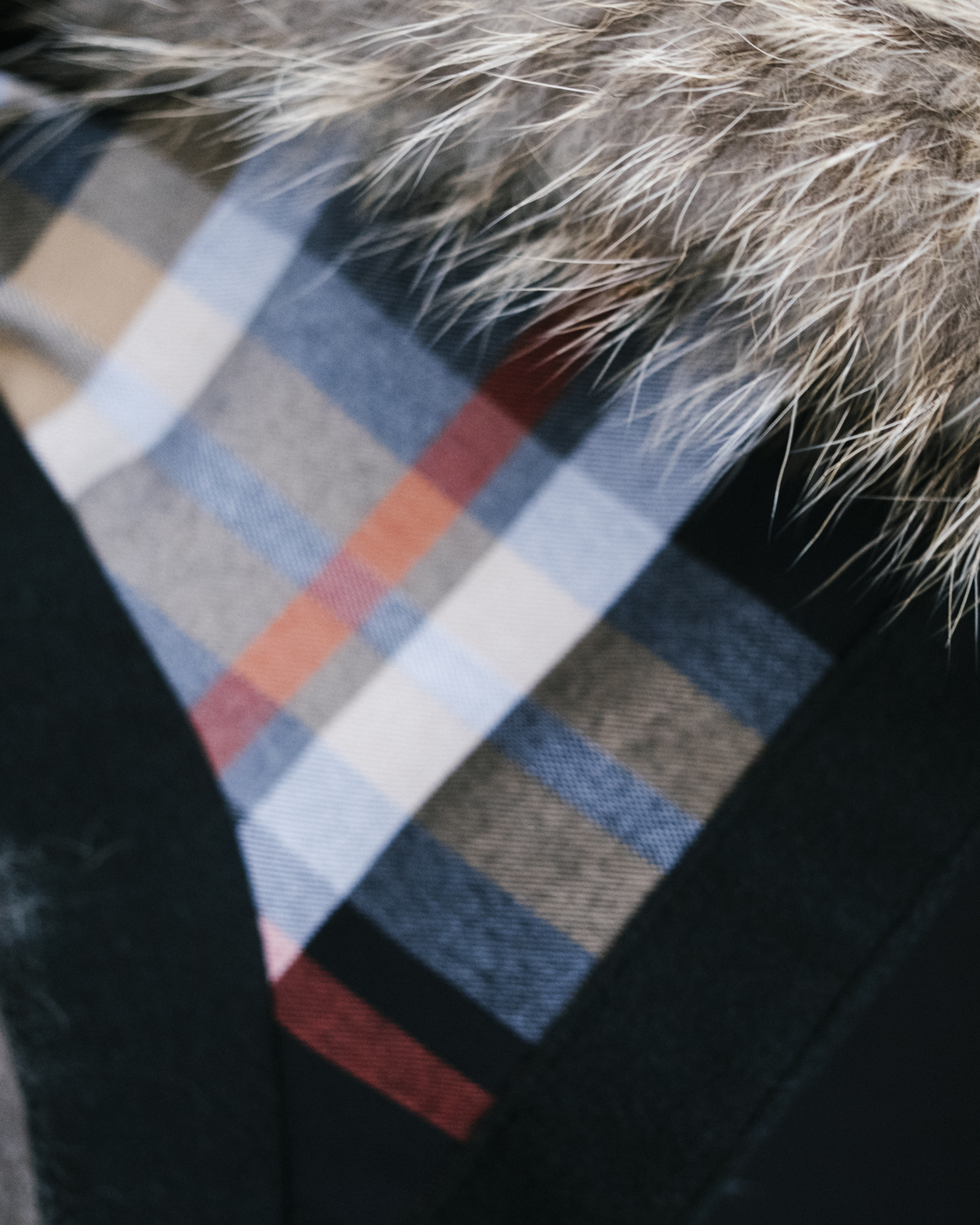 La capucha independiente, rematada con pelo natural y bufanda incorporada, añade un plus de abrigo y versatilidad: puede llevarse abierta, envolviendo el cuello, o recogida para un aire más sobrio. El forro grueso de cuadros, presente tanto en el abrigo como en la capucha, aporta confort térmico y un contraste gráfico que asoma sutilmente al caminar.