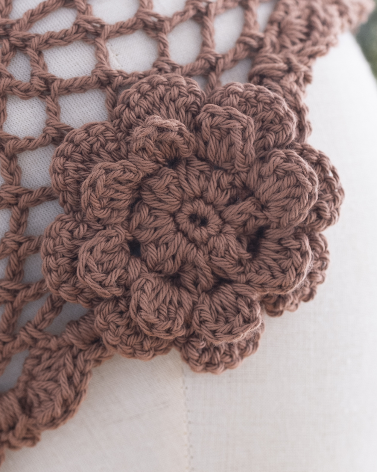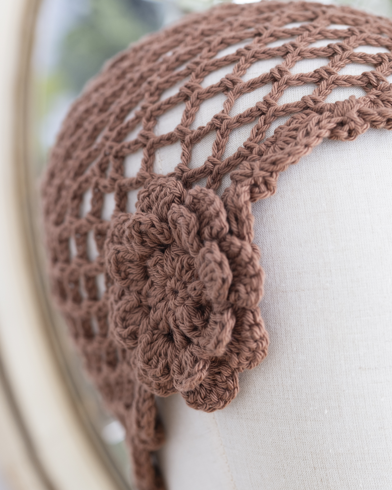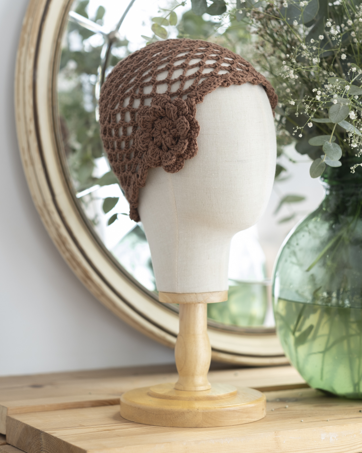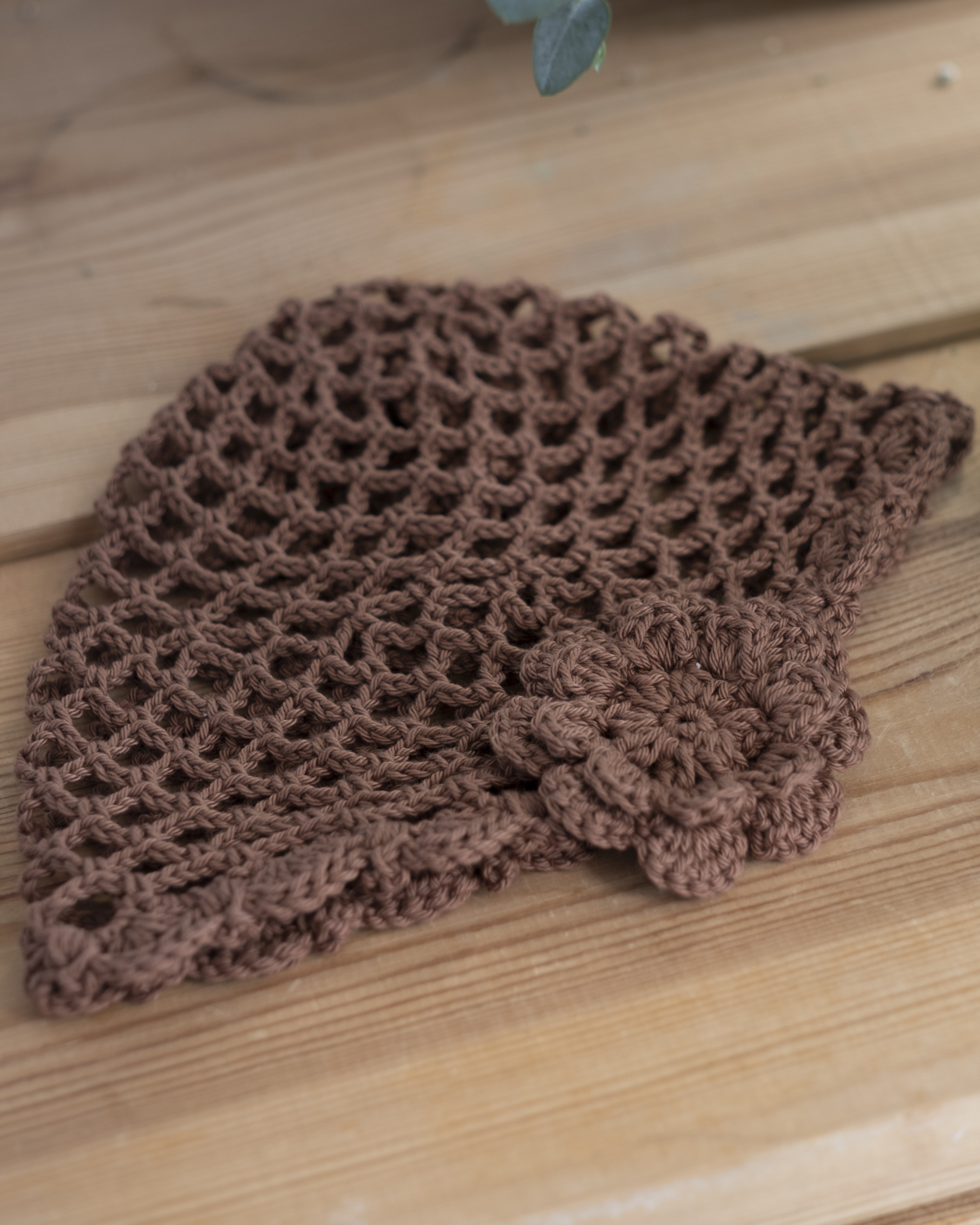 Ligero y con carácter, este gorro está elaborado de forma totalmente artesanal con punto red y flores en relieve, trabajadas en el mismo hilo.