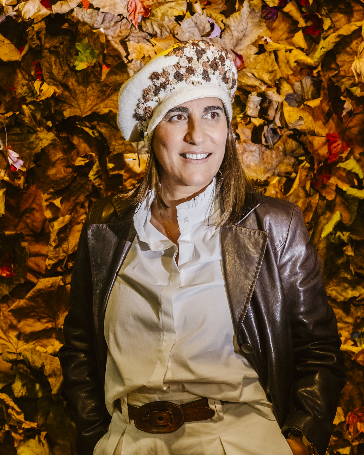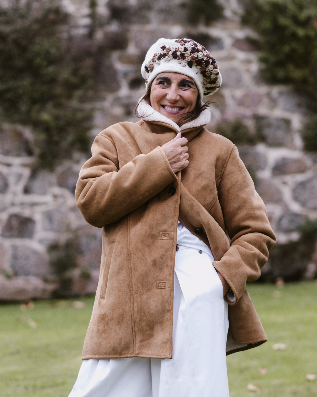 Confeccionada en tejido de lana color lino crudo, destaca por sus delicadas flores bordadas a mano en una paleta de marrones, beige y verde oliva, que aportan calidez y textura.