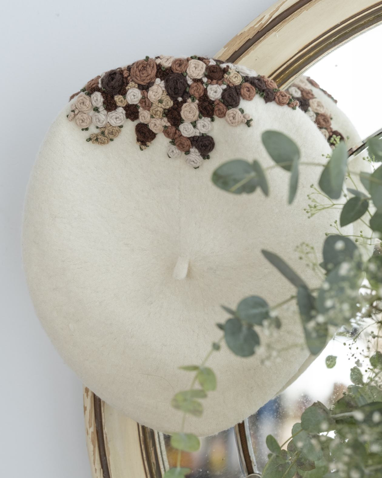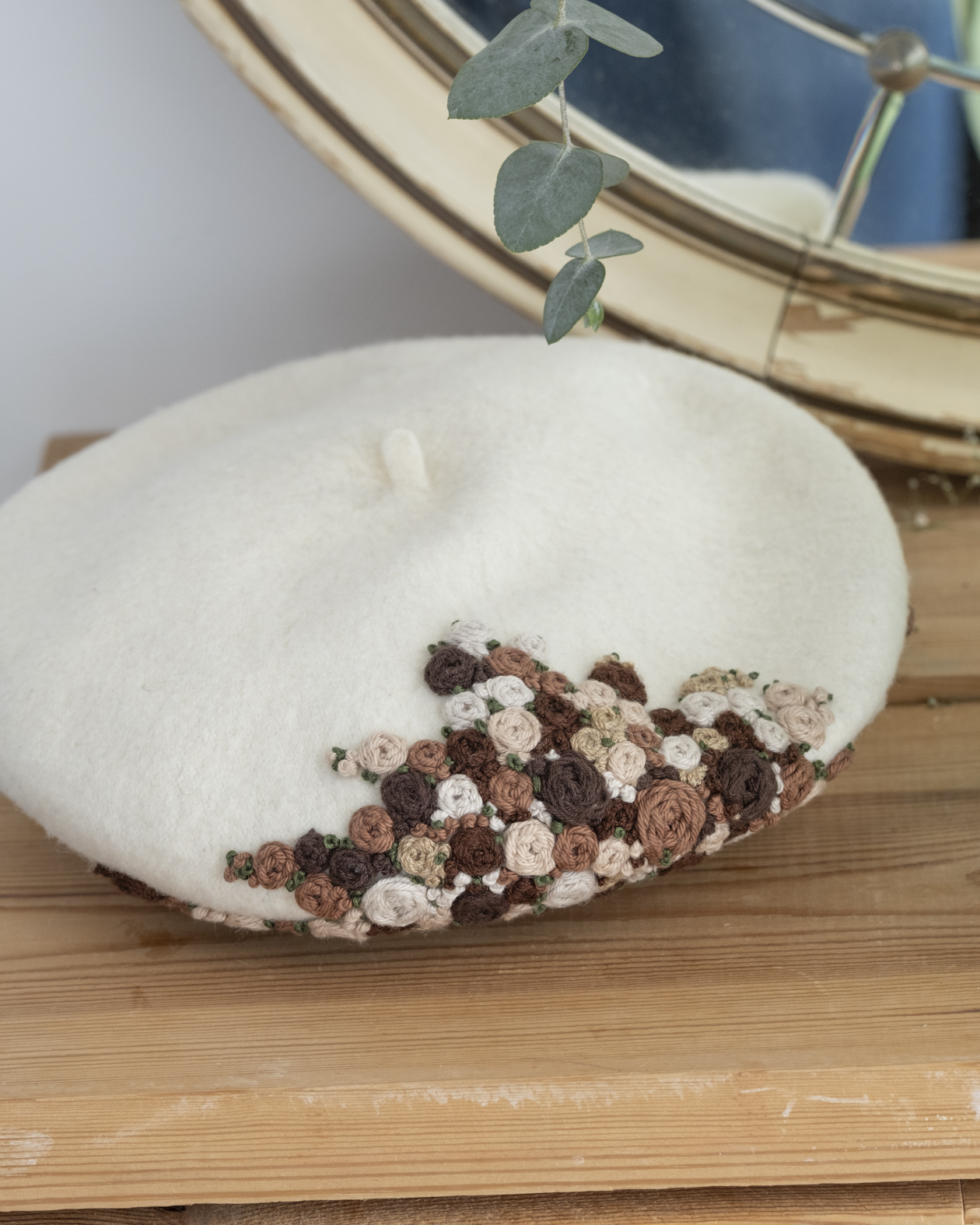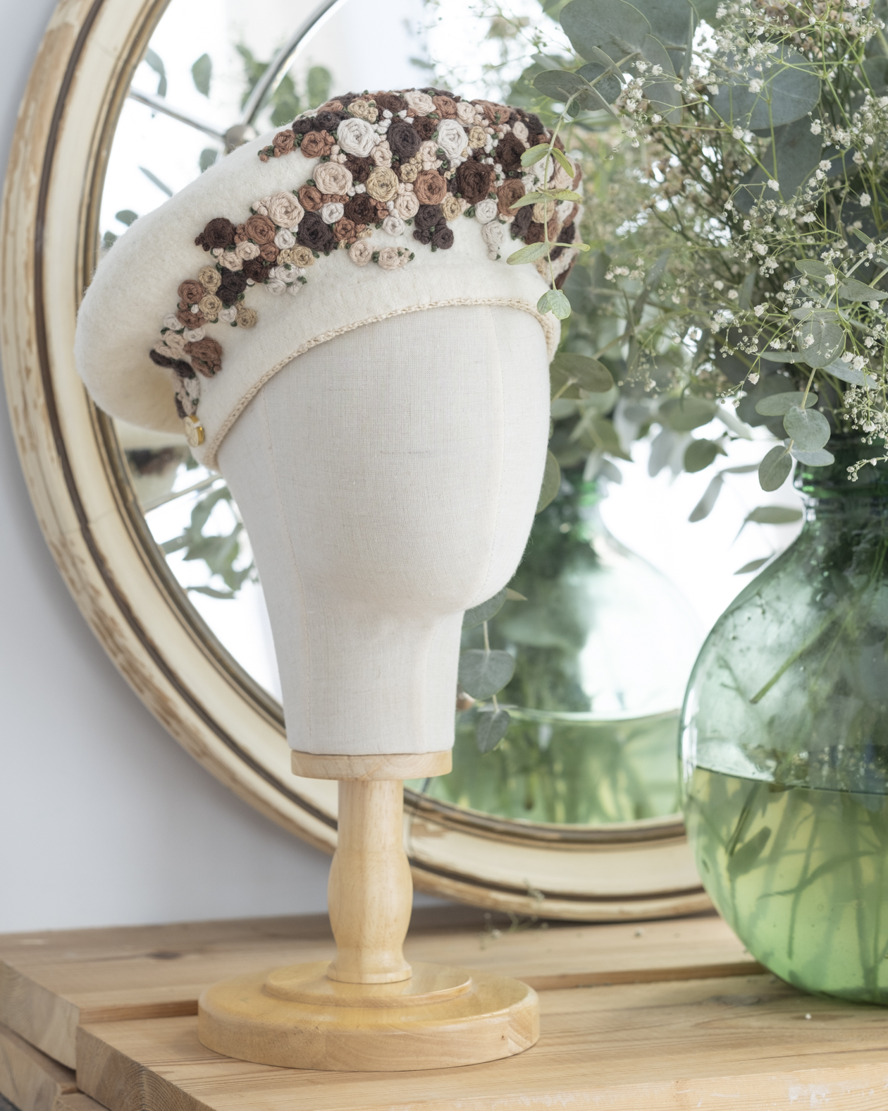 Cada pieza es un pequeño trabajo de arte textil, donde los matices naturales y el detalle del bordado se combinan para crear una boina ligera, romántica y versátil.