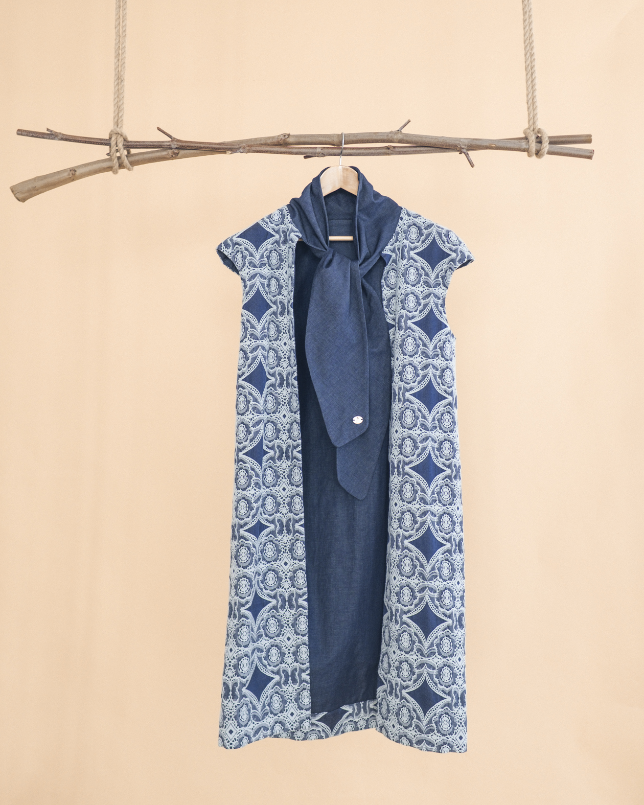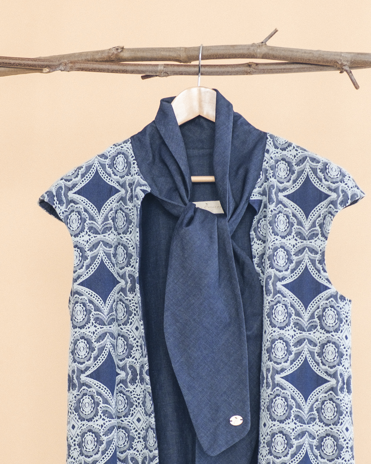 Su diseño abierto en la parte delantera se cierra en la parte superior con un amplio lazo, integrado en el cuello y elaborado en el mismo tejido que el forro, ofreciendo un toque femenino y distintivo.