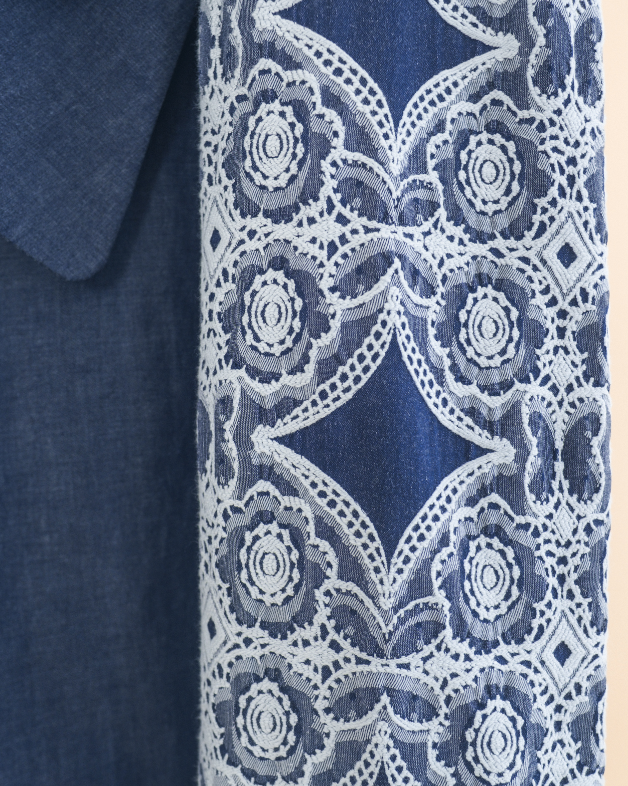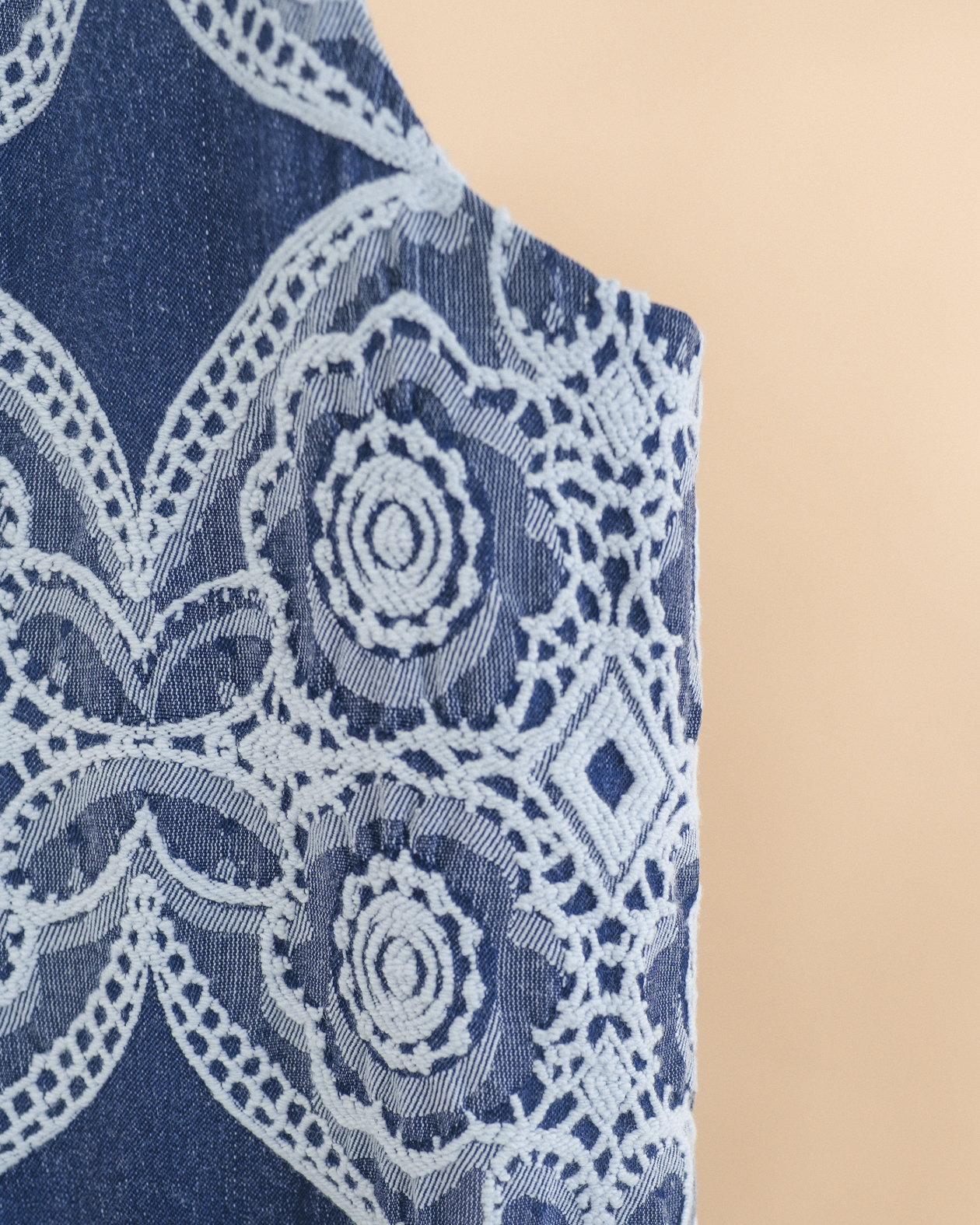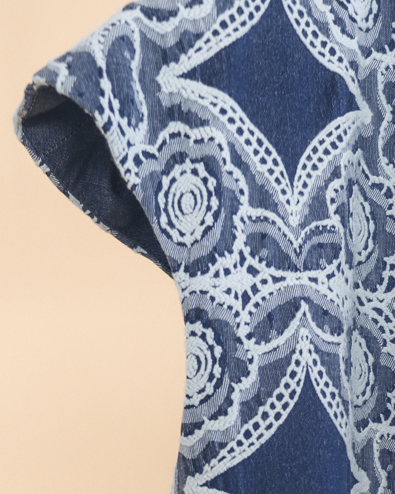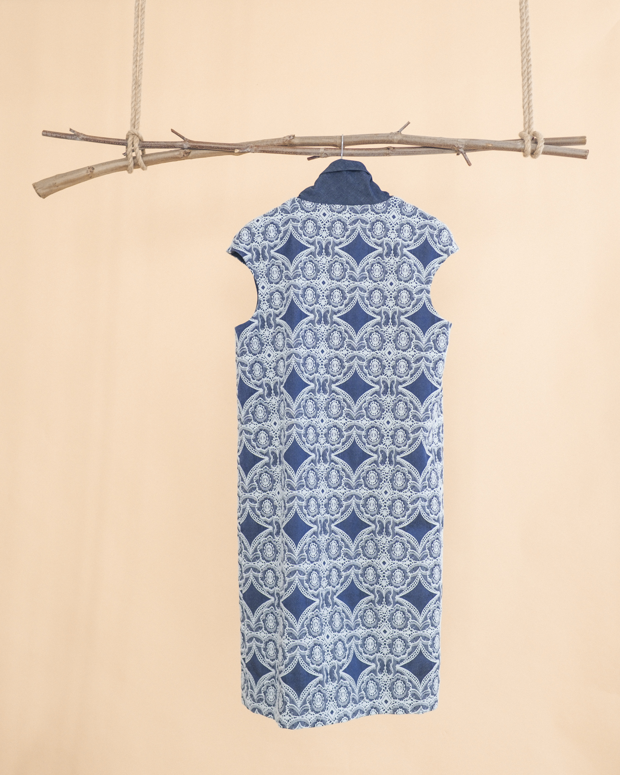Confeccionado en tejido de algodón y elastano, presenta un estampado delicado en tonos azules que contrasta con su forro liso en color tejano, también en algodón y elastano.