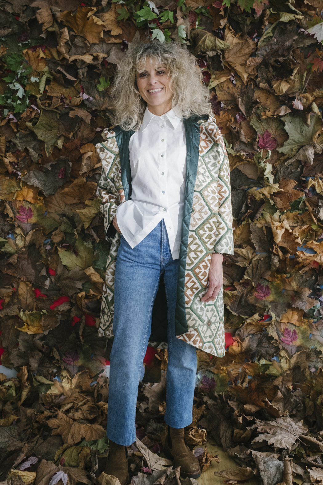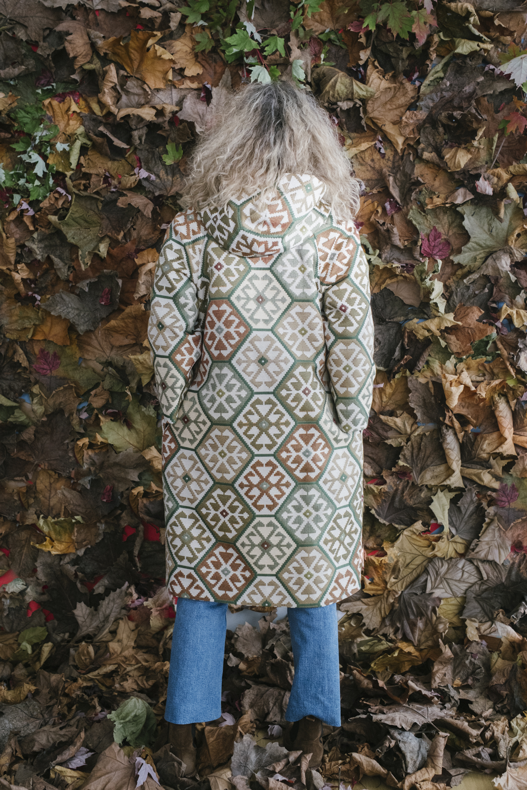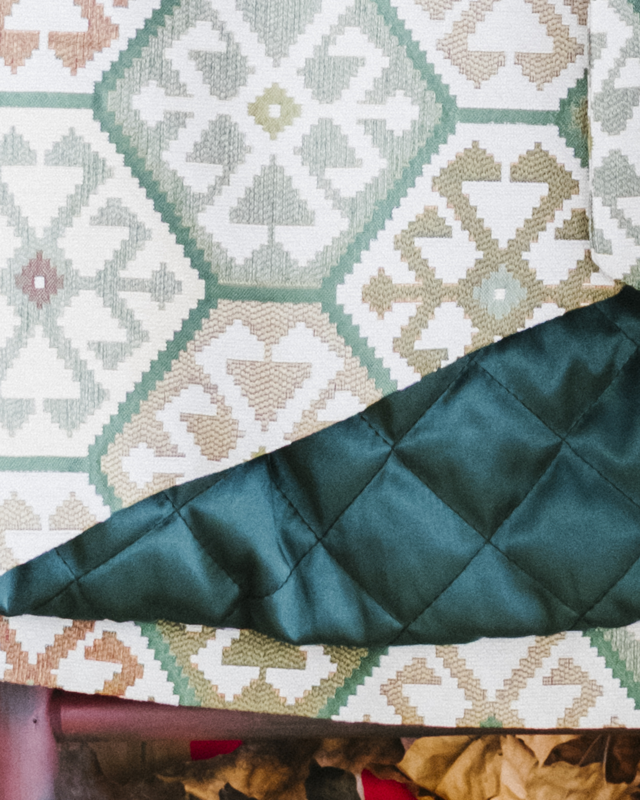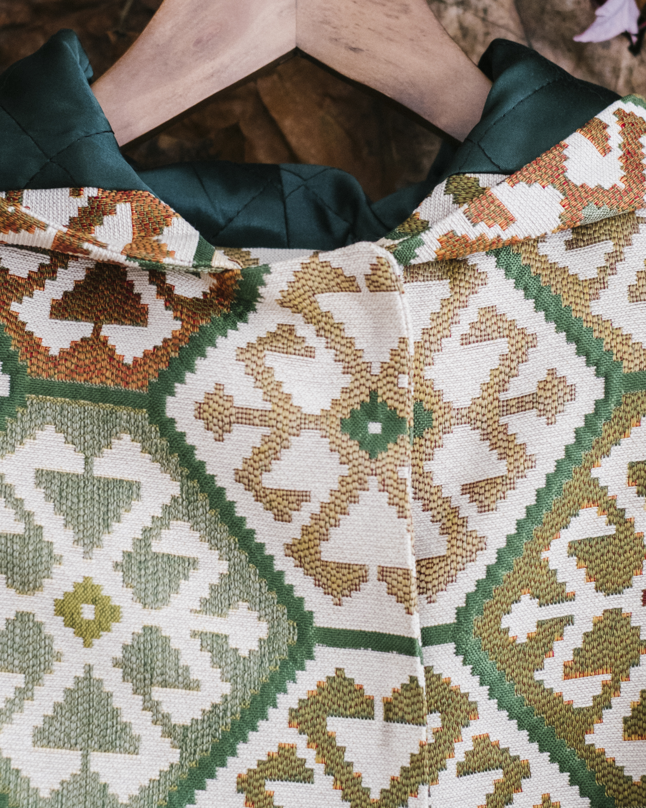 En su interior, un forro acolchado en tono verde recorre tanto el cuerpo como las mangas, convirtiendo cada instante en un acogedor ritual de abrigo.