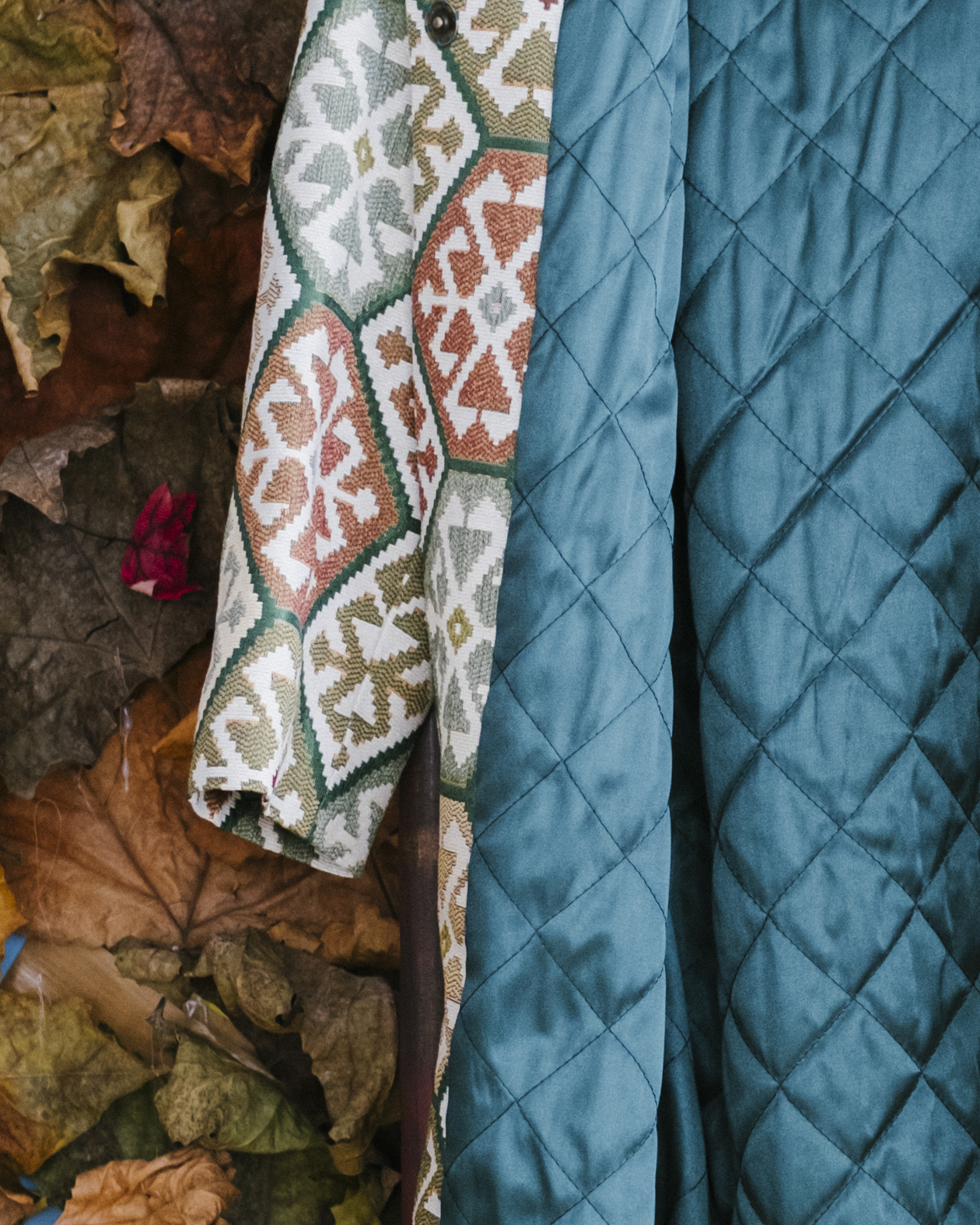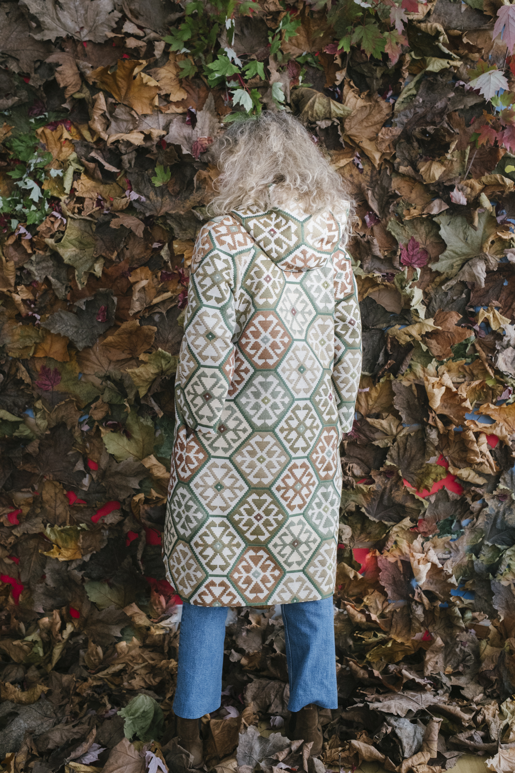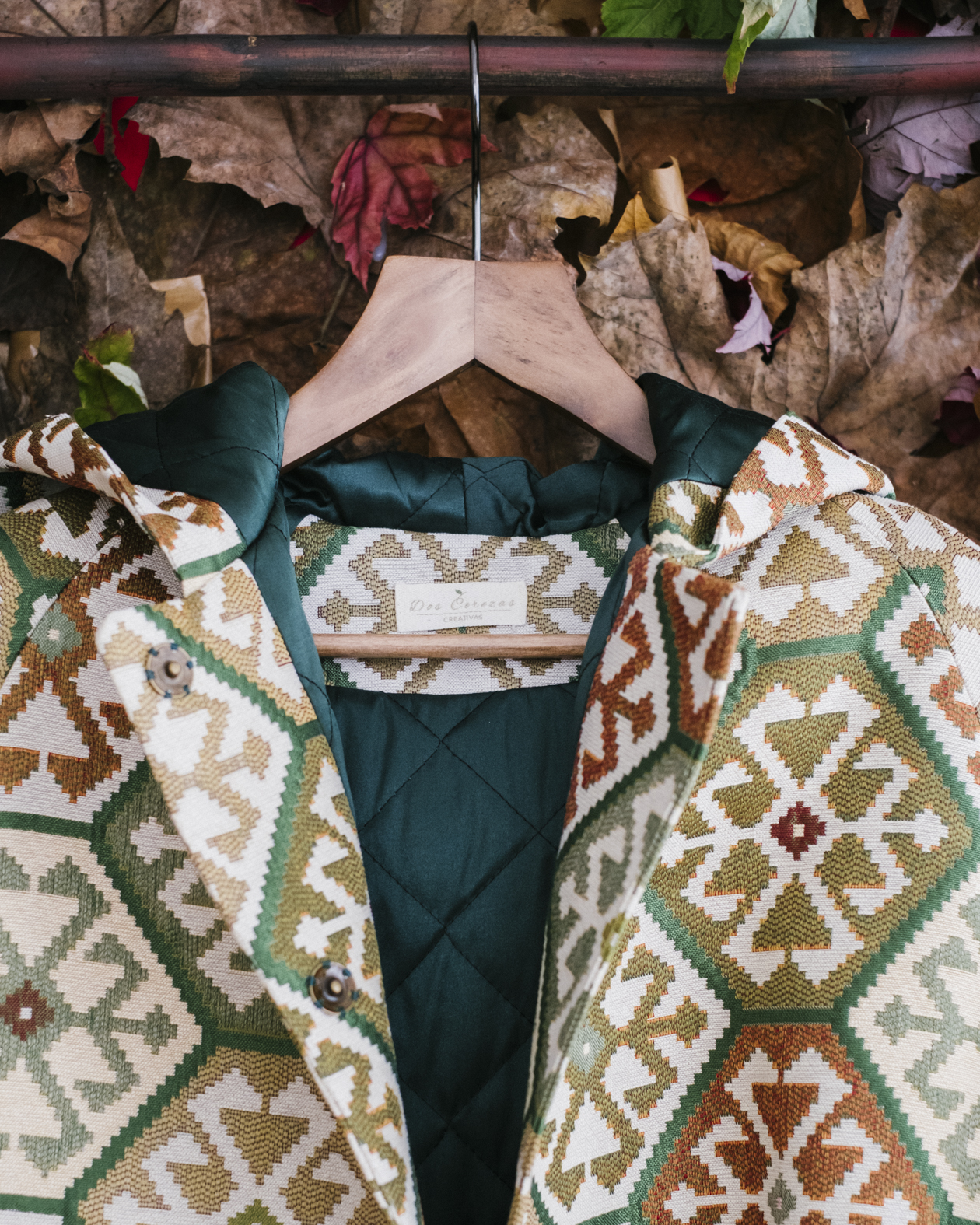 En su interior, un forro acolchado en tono verde recorre tanto el cuerpo como las mangas, convirtiendo cada instante en un acogedor ritual de abrigo.
