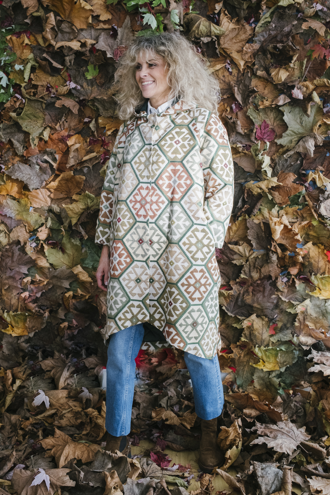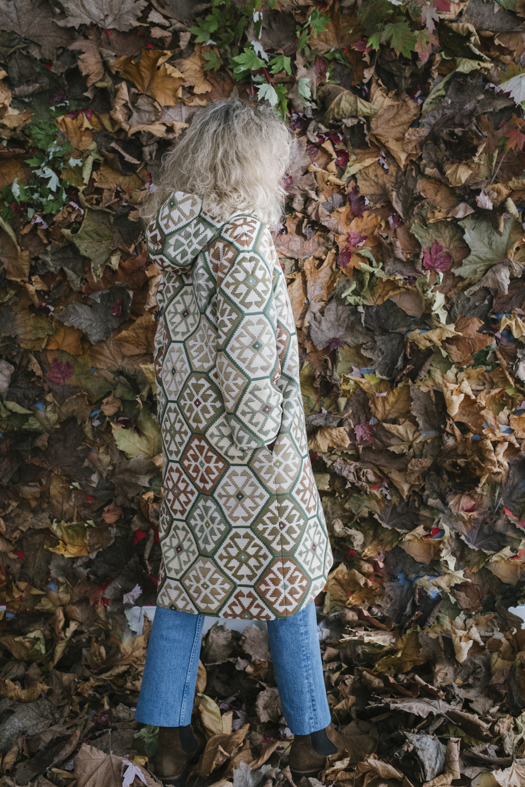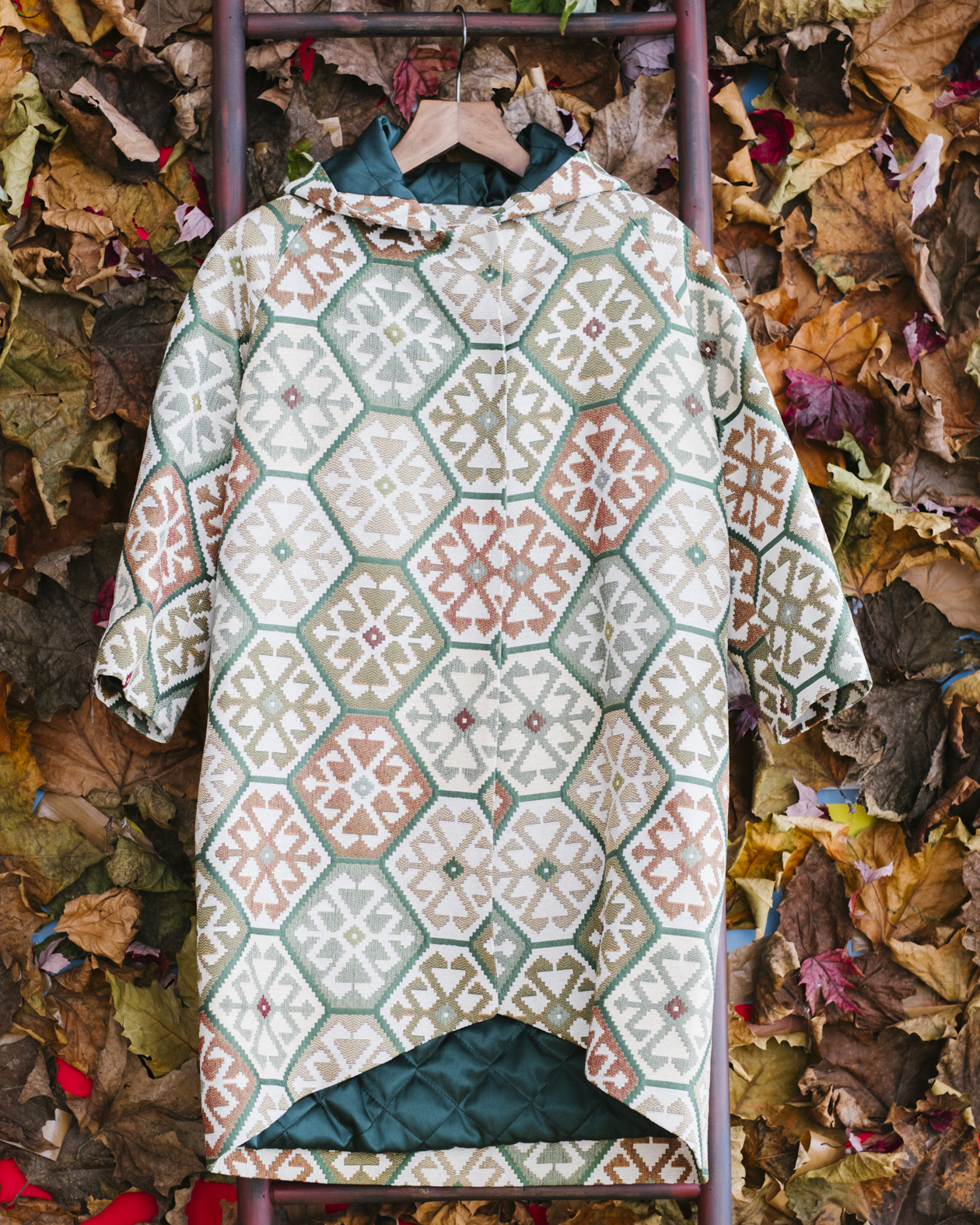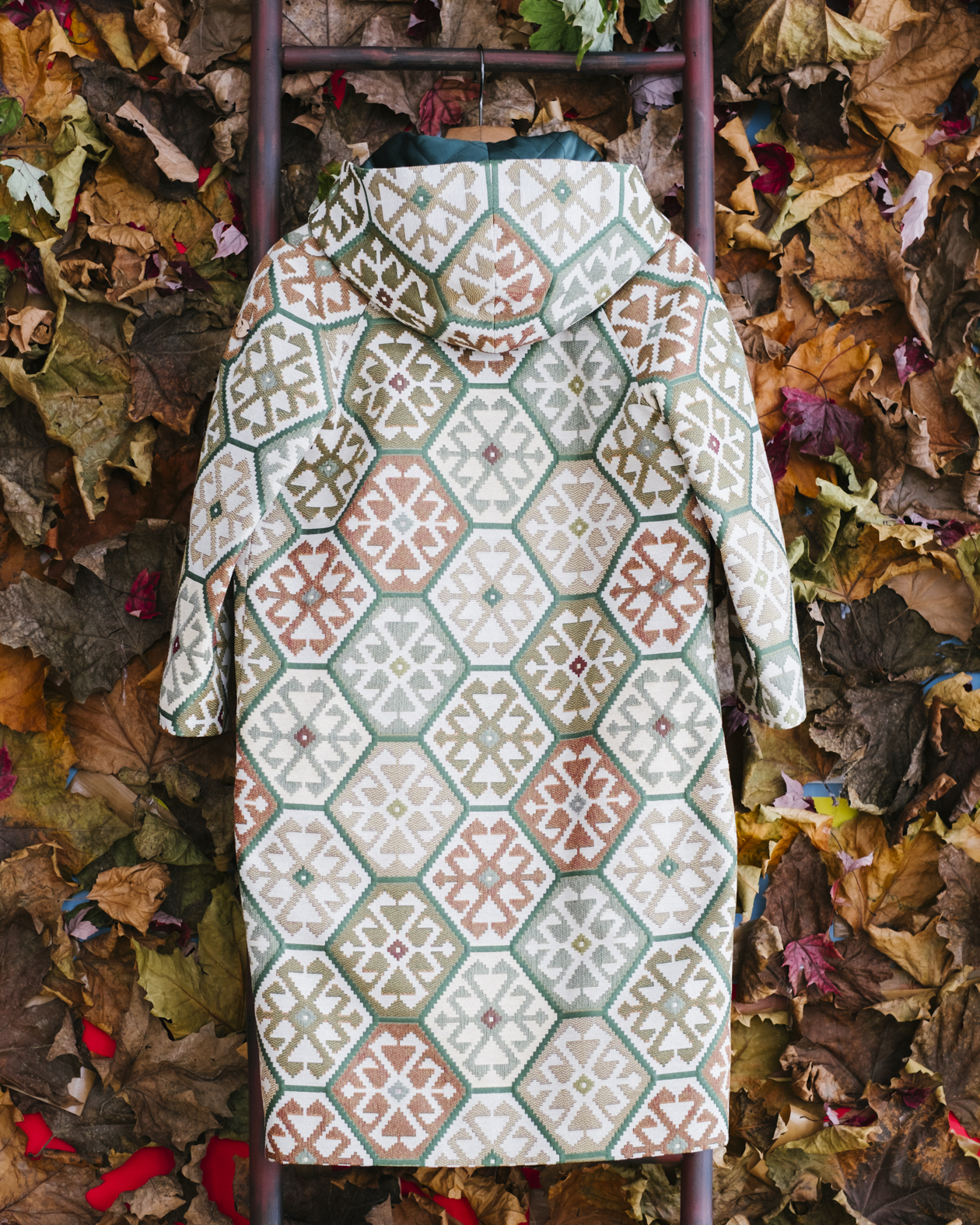 En su interior, un forro acolchado en tono verde recorre tanto el cuerpo como las mangas, convirtiendo cada instante en un acogedor ritual de abrigo.