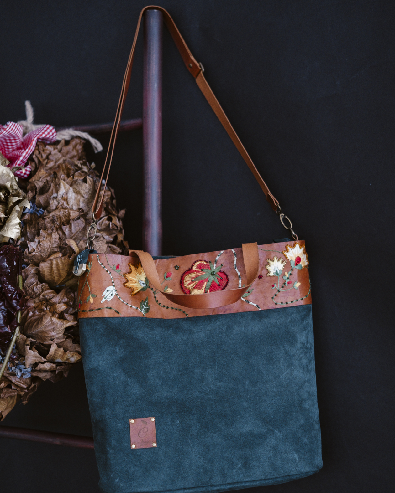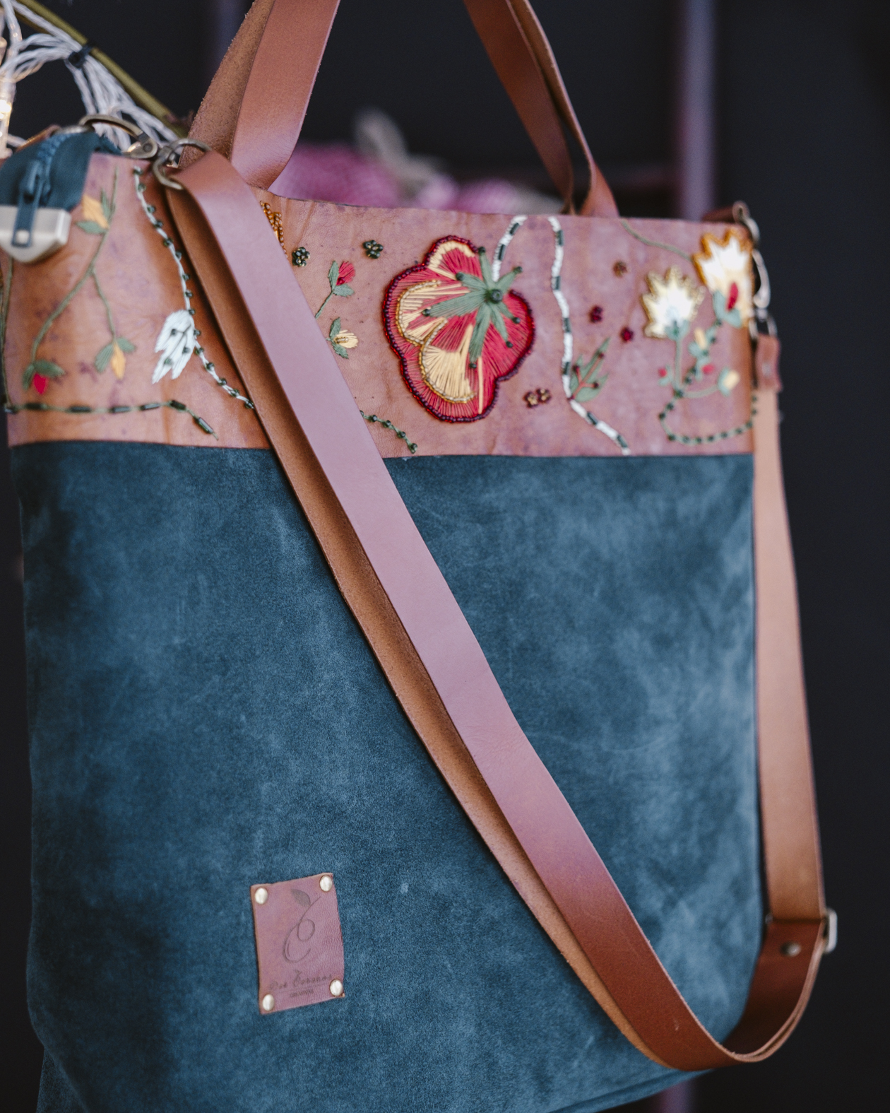 Bolso en serraje con vitola de cuero bordada
