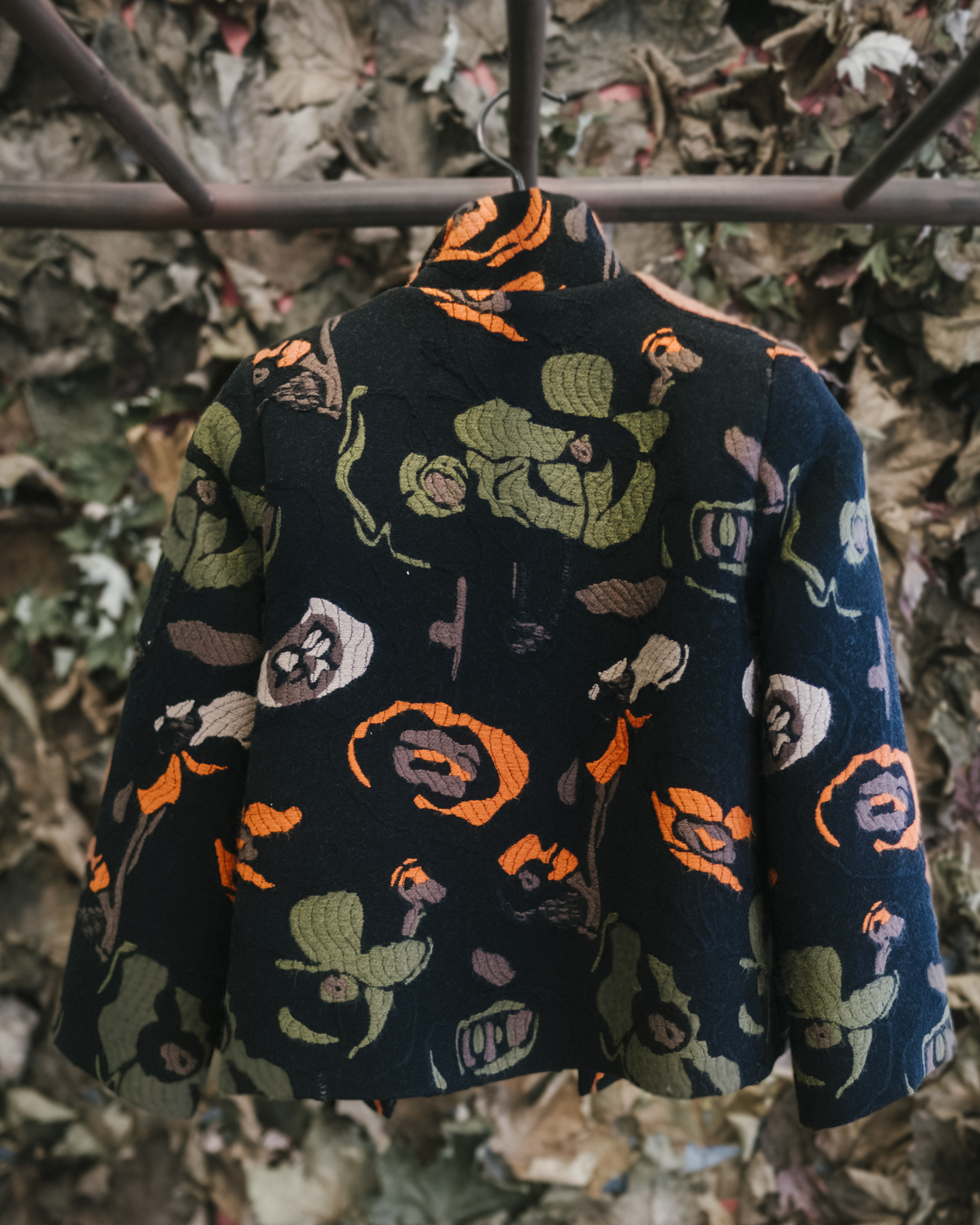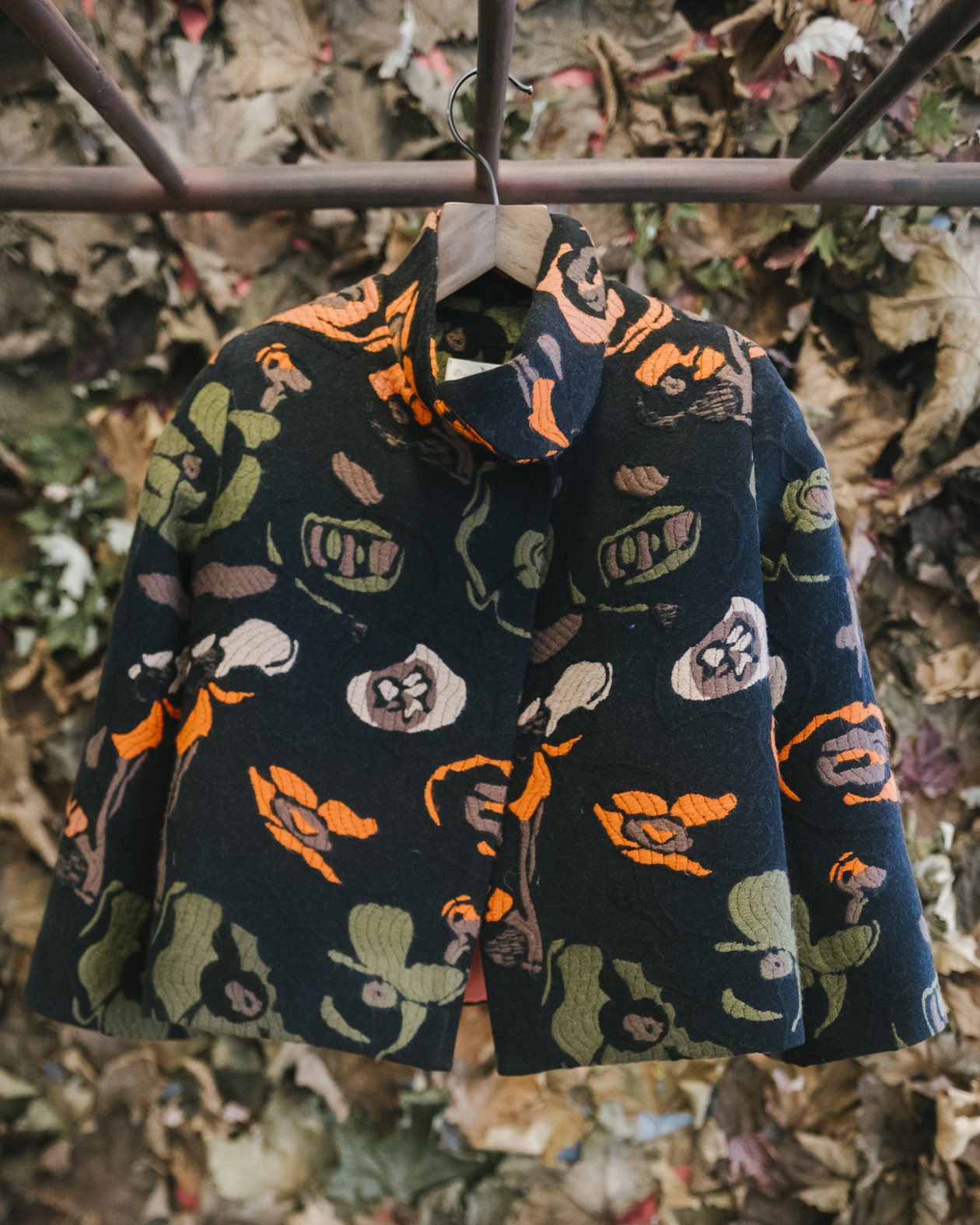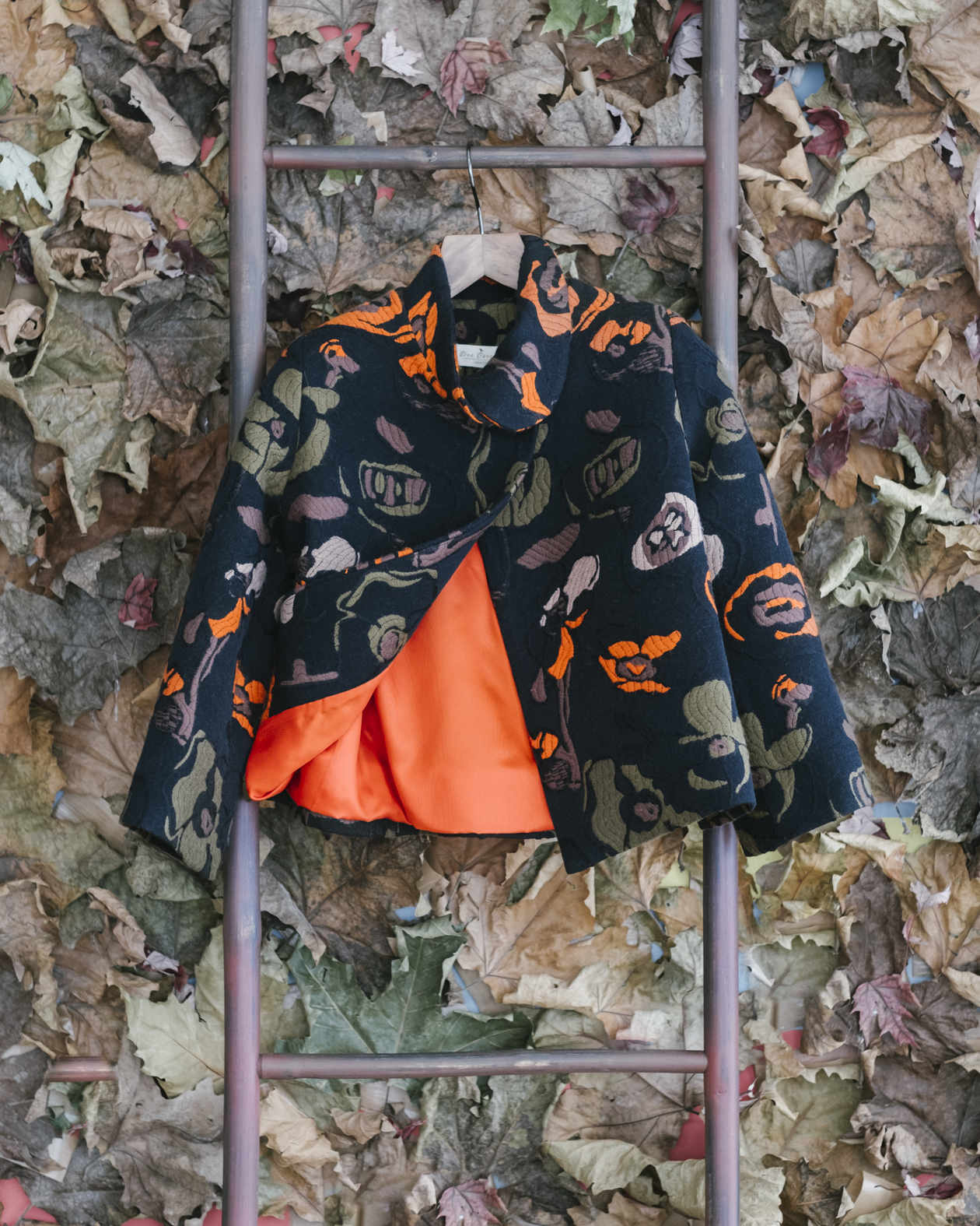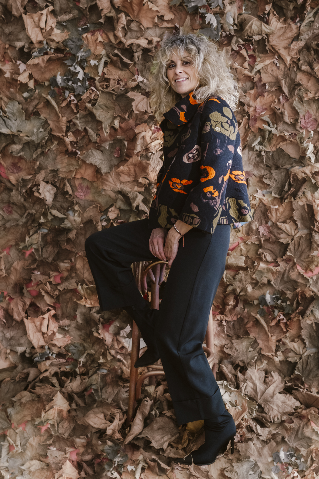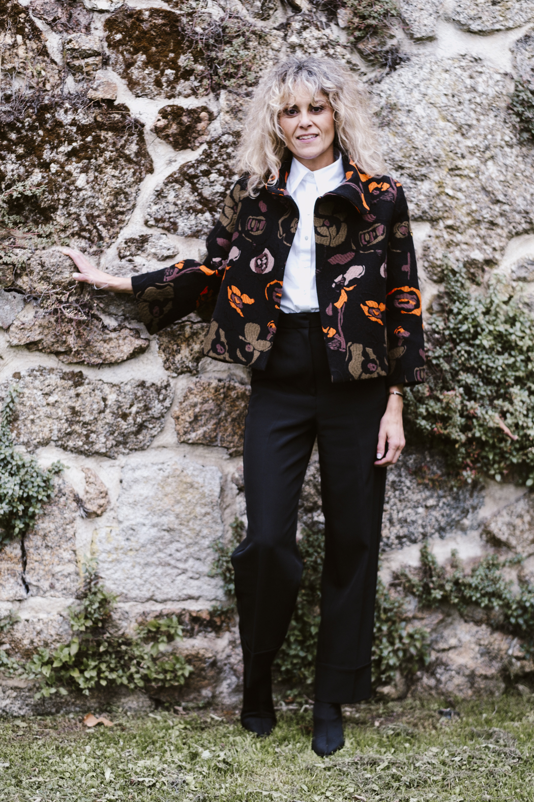 De corte ligeramente evasé y manga tres cuartos con hombreras, THALVI destaca por su cuello asimétrico, que forma parte del propio cierre y otorga personalidad a la silueta.