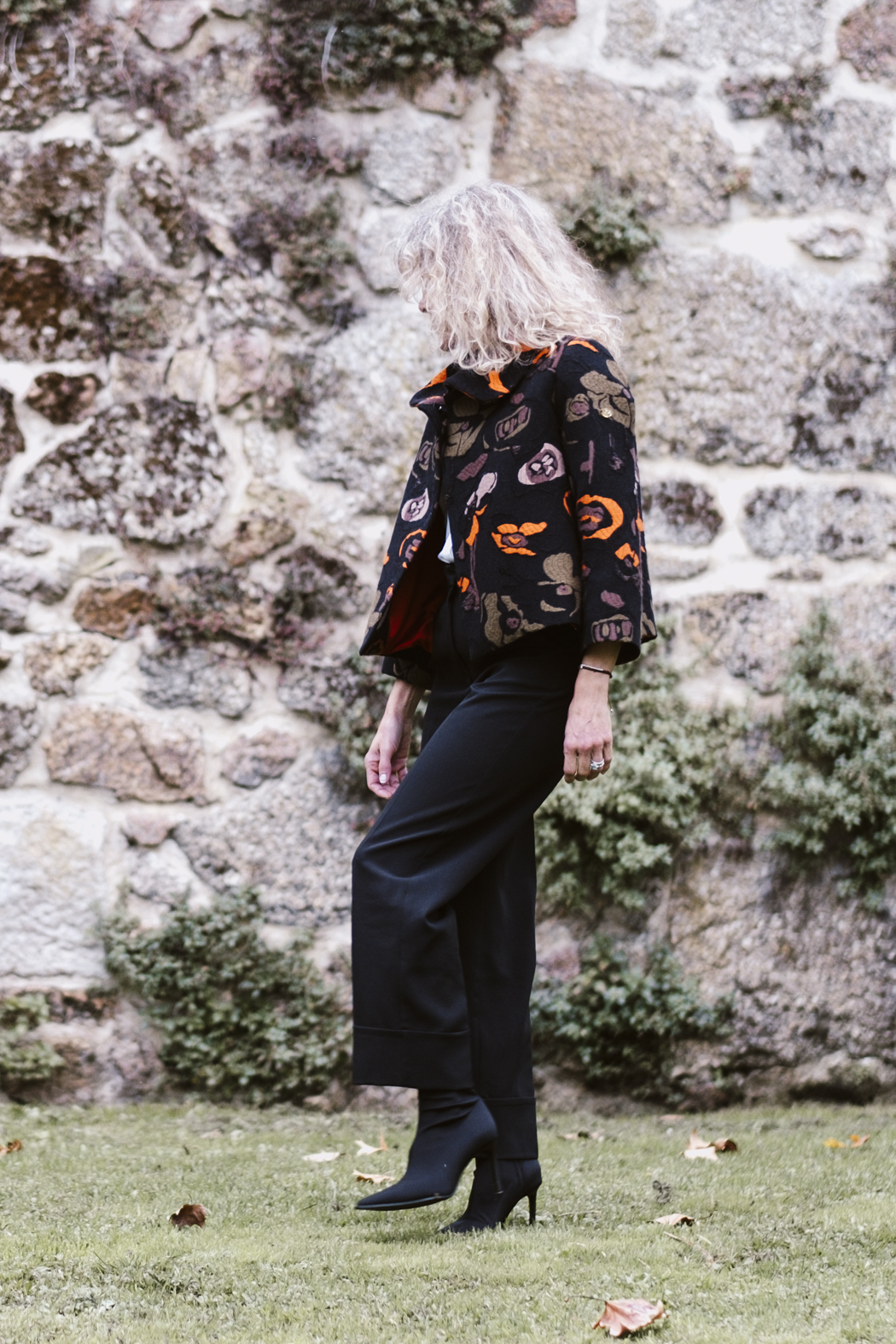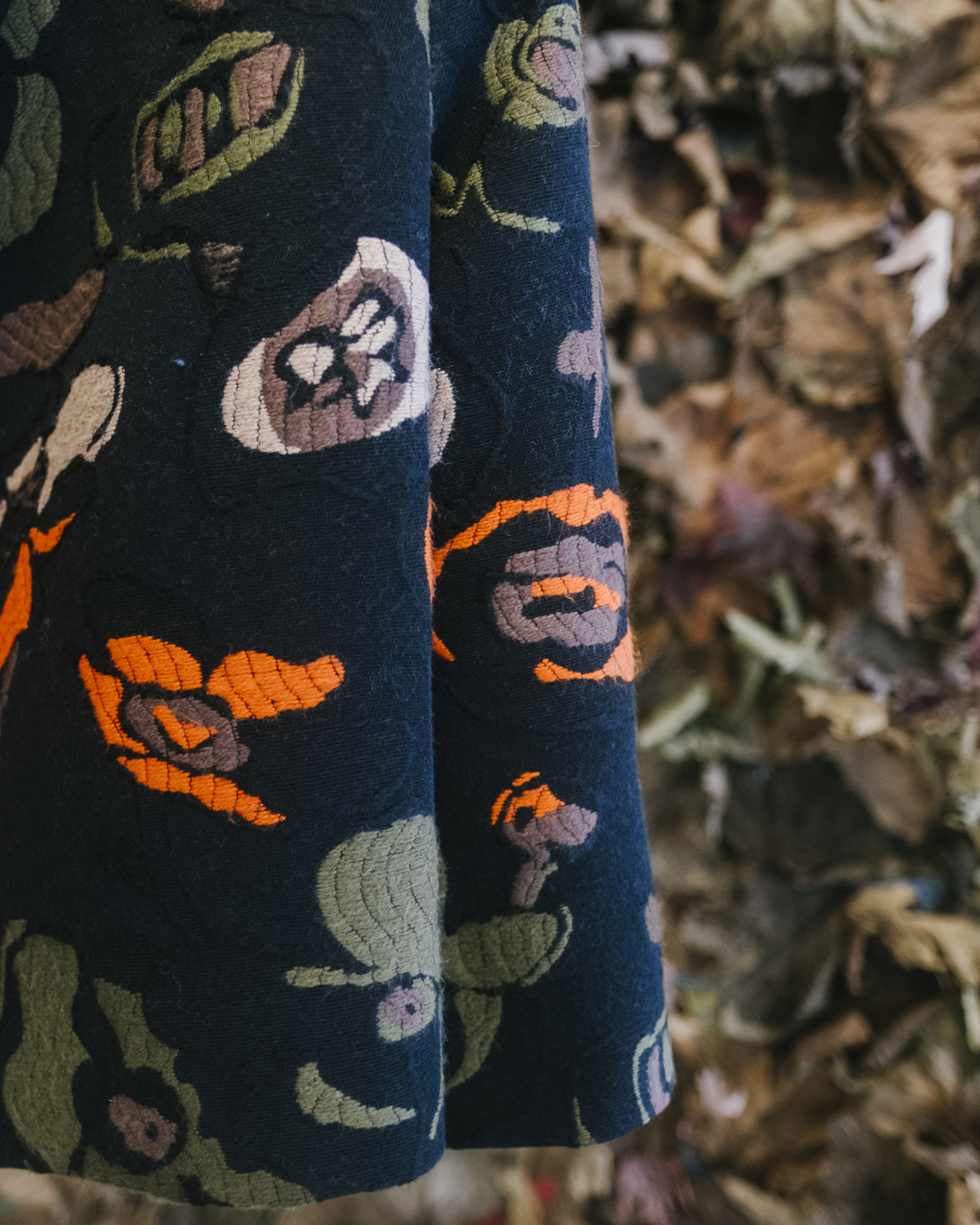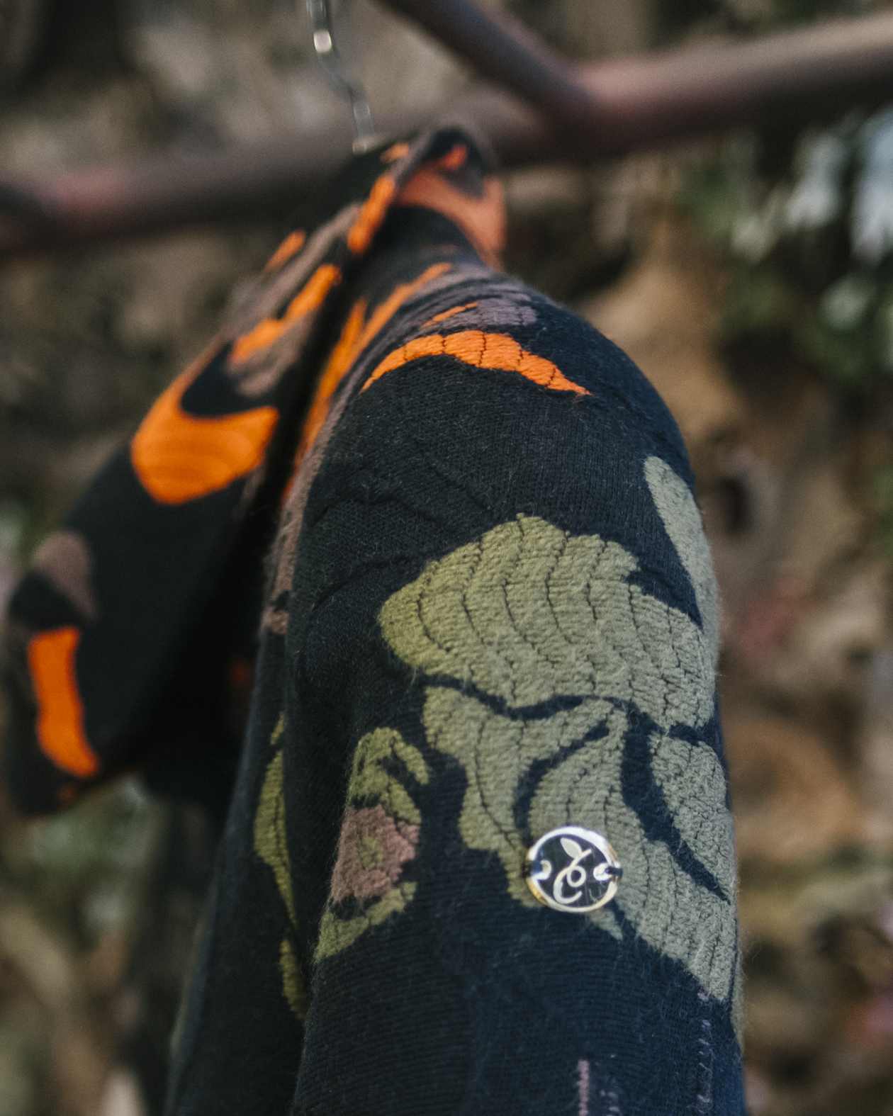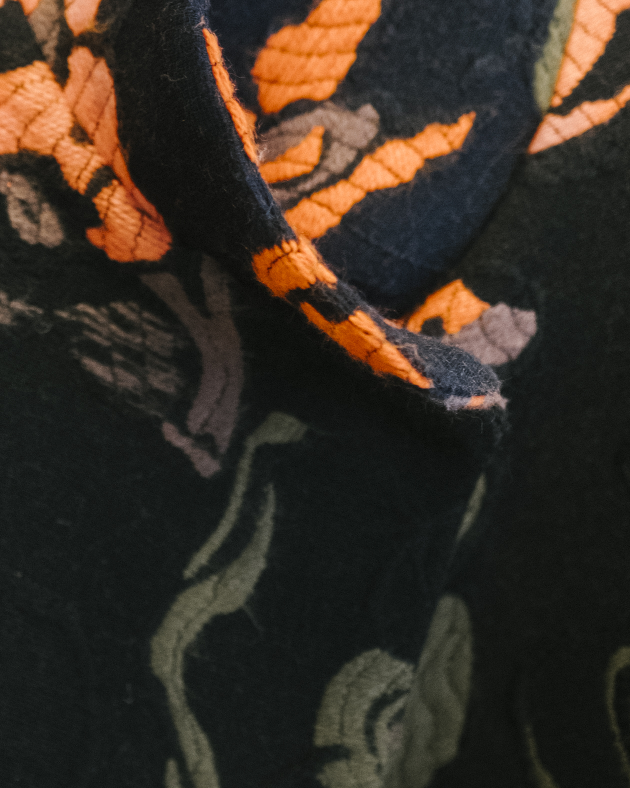 Su fondo negro se anima con un estampado floral en tonos naranja, topo, mousse y verde caqui, creando un equilibrio entre intensidad y armonía.