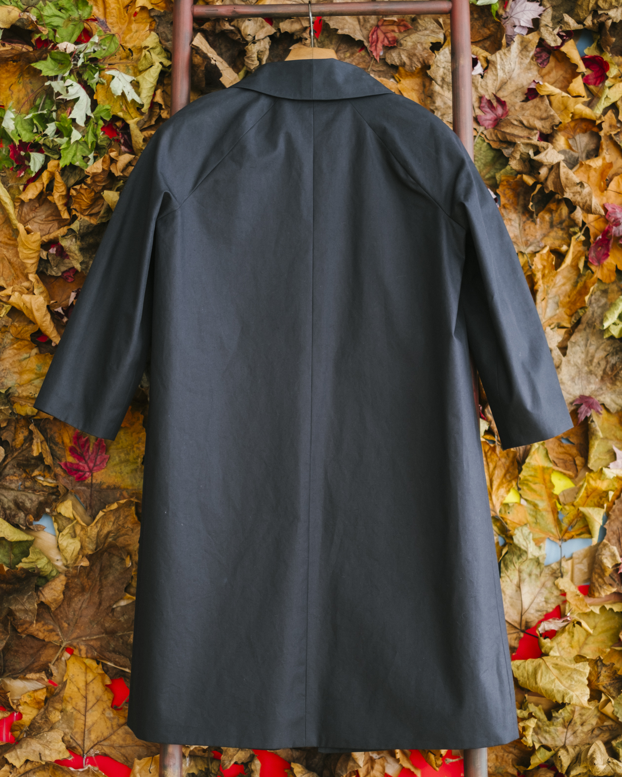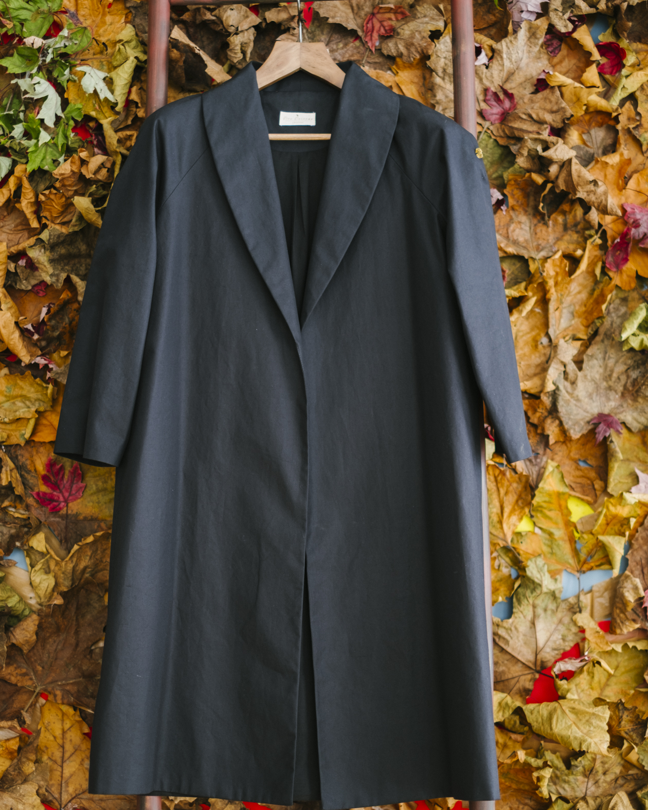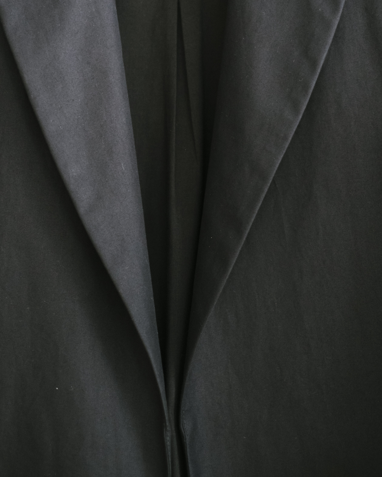 El diseño con manga ranglan y amplio cuello tipo smoking aporta estructura y movimiento, mientras que el forro interior, también de algodón negro, mantiene la coherencia estética y el confort.