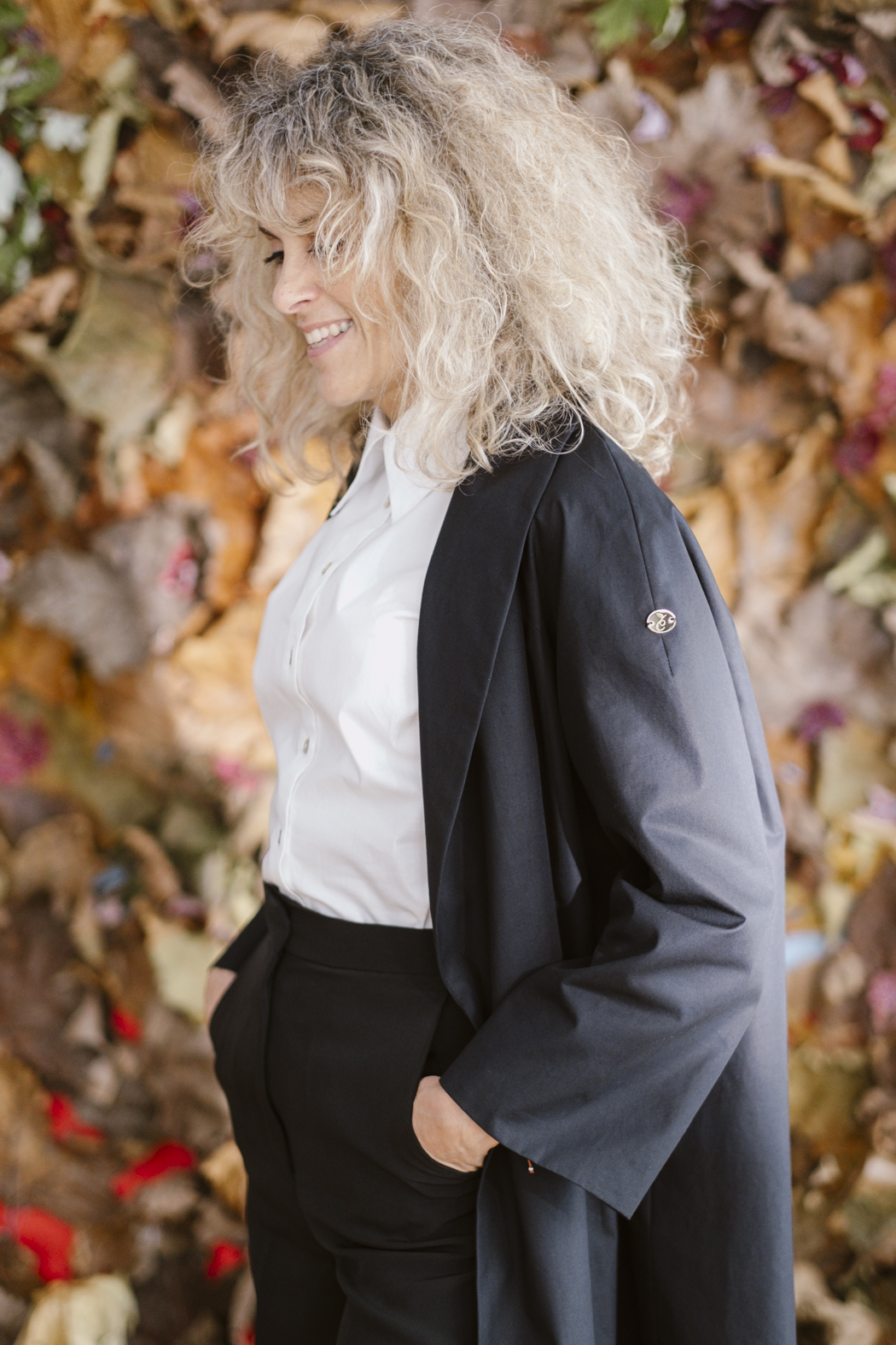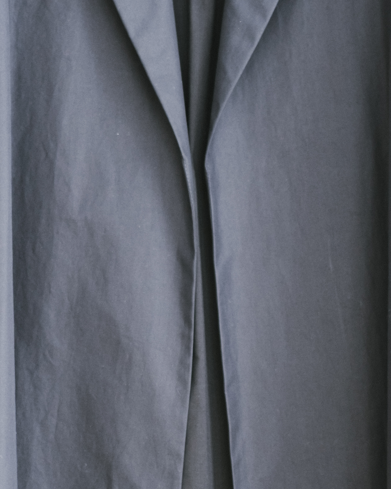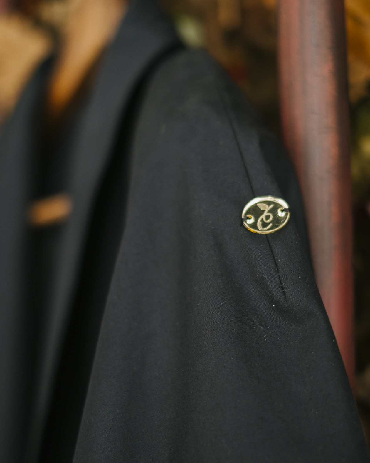 El diseño con manga ranglan y amplio cuello tipo smoking aporta estructura y movimiento, mientras que el forro interior, también de algodón negro, mantiene la coherencia estética y el confort.